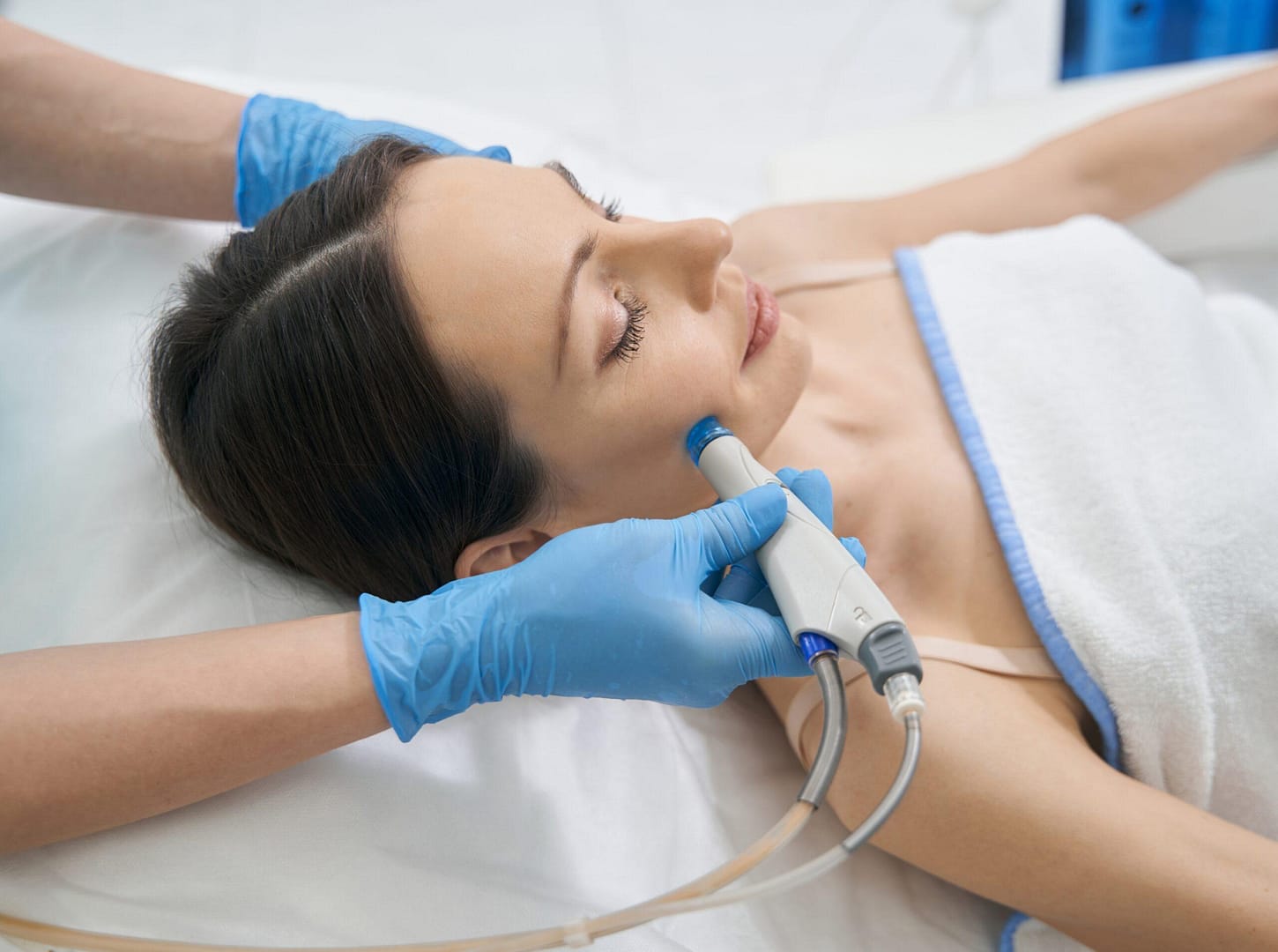 A HydraFacial uses gentle, water-based suction to cleanse your pores without irritation. In areas with pustules or congestion, this technique helps release trapped fluids and impurities, supporting your skin’s natural healing process.